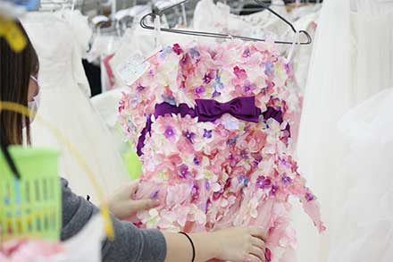 ウェディングドレスの素材は繊細なものが多く、美しいシルエットを損なわずに仕上げなくてはいけません。乾燥機ではなく、乾燥室を使っているお店なら、最後の仕上げでのトラブルが避けられます。シルク素材や、ラメやスパンクオールなどは、熱に弱いので、乾燥時の温度も肝心です。