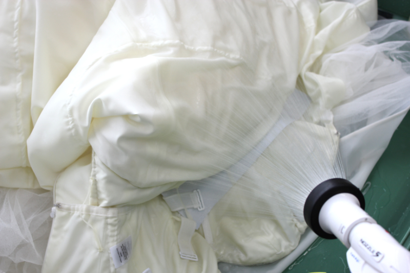 ウェディングドレスのシミ抜き技術|裾の汚れと超音波シミ抜き工程