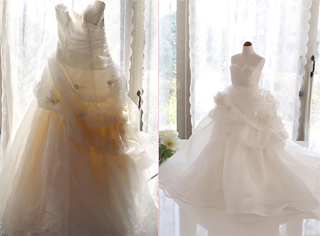 左が元のウェディングドレス、右がウェディングドレスから制作したベビードレスです。